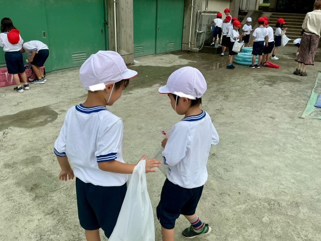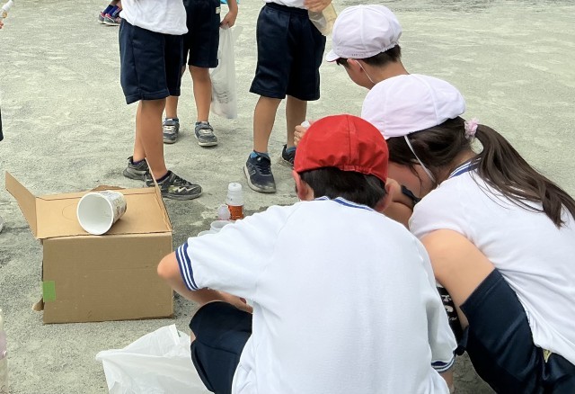 ペットボトルやゼリーカップなどを組み合わせて水遊びの道具を手作りしたり、ダンボールの的を作って的当てゲームを考案したりと、子どもたちの楽しい発想が生きた活動になりました。