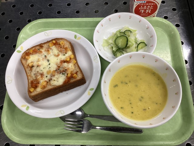 今日は、ツナチーズトースト、グリーンサラダ、かぼちゃのポタージュ、牛乳です。