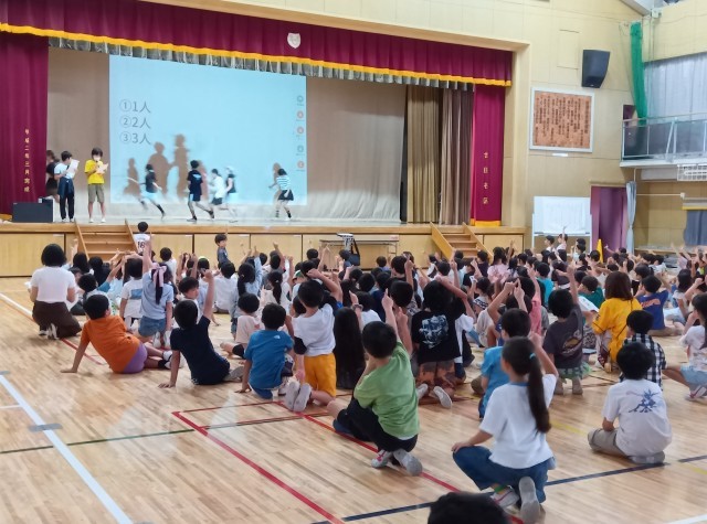問題の後に、集会委員の子どもたちがステージの上を通ります。