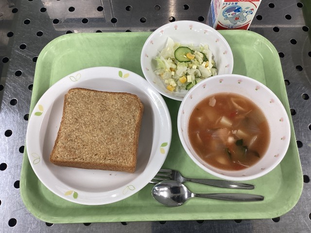 今日は、セサミトースト、チーズ入りフレンチサラダ、トマトとポテトのスープ、牛乳です。