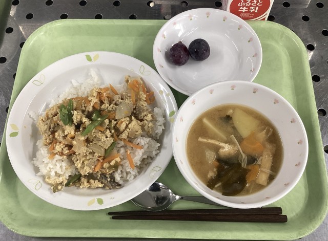今日は、他人丼、じゃがいもと油揚げのみそ汁、巨峰、牛乳です。