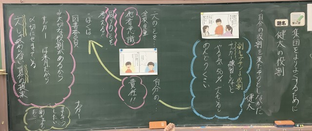 テーマは、「集団をより良くするために」です。1学期の道徳「私は飼育委員」の学習では、自分の役割を果たすことの大切さについて考えました。今回は、さらに深く考える教材でした。