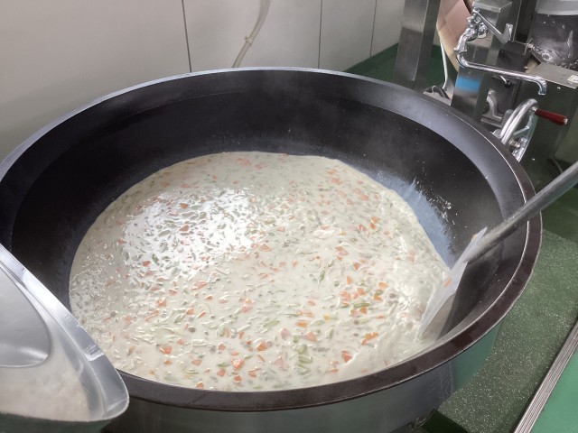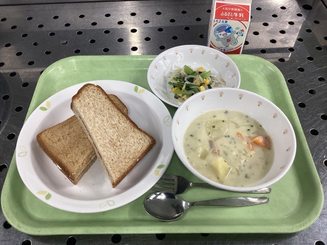 今日は、二色サンド(クリームチーズ、いちごジャム)、江戸菜とコーンのサラダ、クリームシチュー、牛乳です。