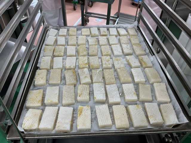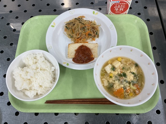 今日は、ごはん、いかのチリソース、チャプチェ、たまごスープ、牛乳です。