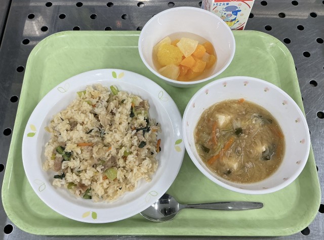 今日は、焼肉チャーハン、白ごまタンタンスープ、フルーツポンチ、牛乳です。