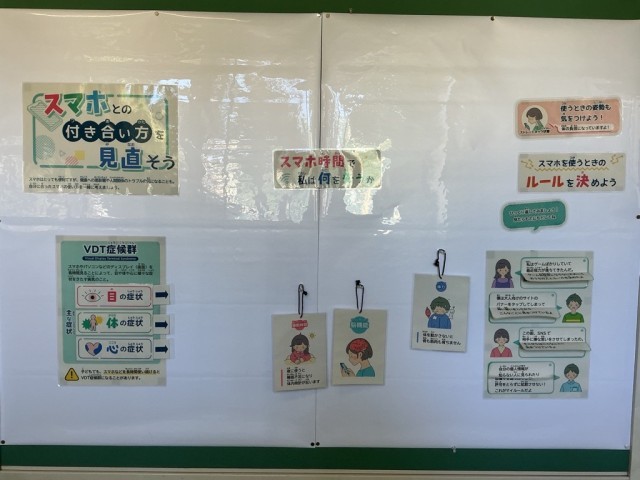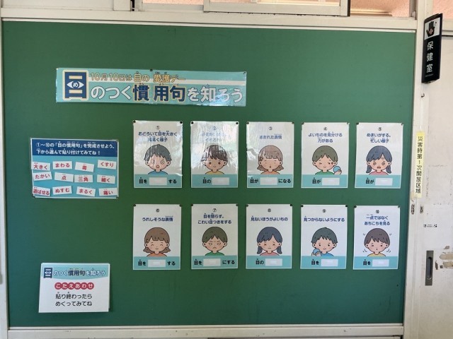 それにちなんで、保健室前には「目のつく慣用句」について掲示しています。また、常時掲示として「スマホとの付き合い方を見直そう」の掲示もあります。