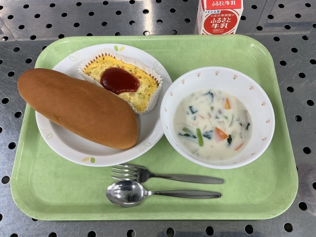 今日は、あしたばパン、スペイン風オムレツ、小松菜のクリームスープ、牛乳です。