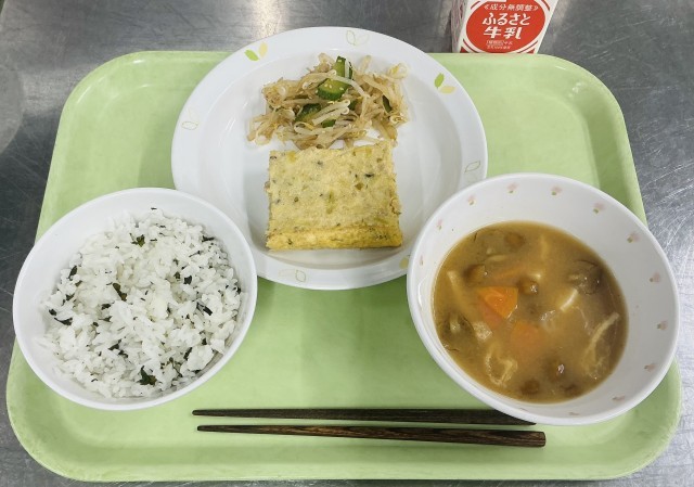 今日は、わかめごはん、卵焼き、野菜のピリ辛、なめこと豆腐のみそ汁、牛乳です。