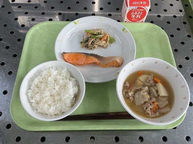 今日は、ごはん、魚の塩焼き、野菜のごまみそかけ、豚汁、牛乳です。