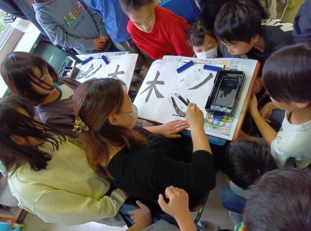 先生の周りに集まり、先生が実際に書く様子を見る3年生の目は真剣そのもの★