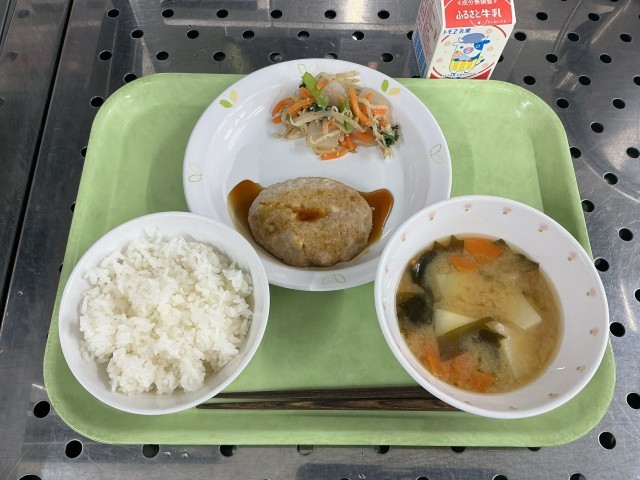 今日は、ごはん、ごはんどろぼうなハンバーグ、こんにゃくサラダ、じゃがいもとわかめのみそ汁、牛乳です。