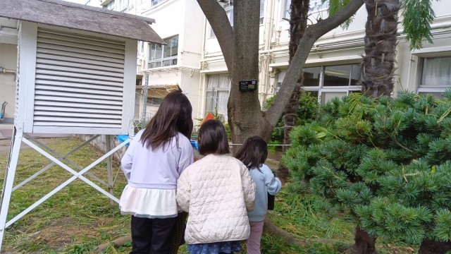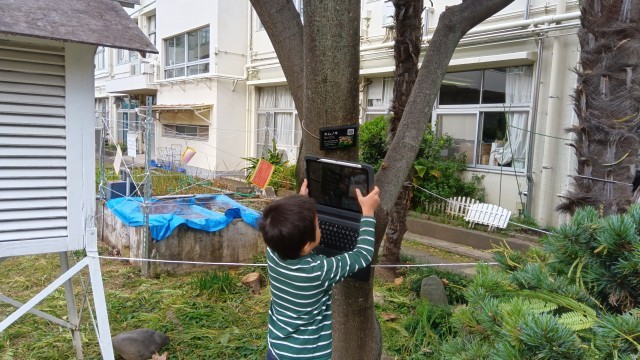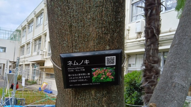 先日、エコ・グリーン委員会とPTAエコ会計の共同作業で設置した「樹木札」が大活躍。二次元コードを読み取ると、その植物について調べることができます。1年生でも、簡単に調べることができました。