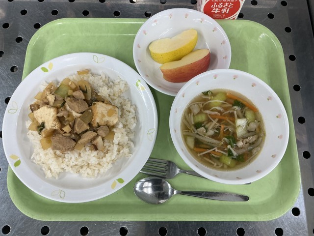 今日は、ルーローファン、ビーフンスープ、りんご食べ比べ(赤:サンふじ、黄:シナノゴールド)、牛乳です。
