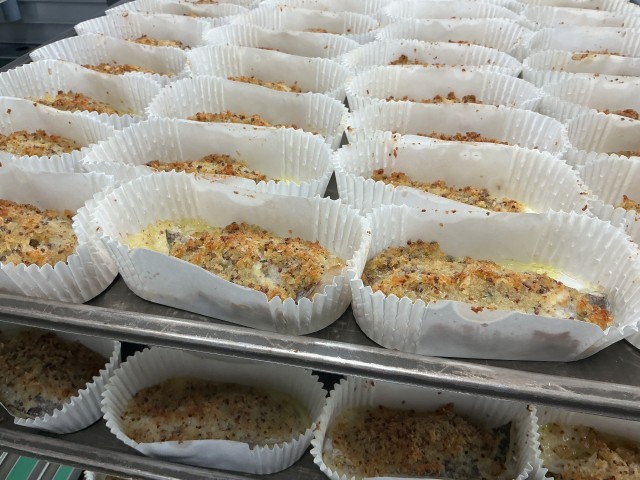 今日は、ミルクパン、魚のガーリックパン粉焼き、枝豆サラダ、森のチャウダー、牛乳です。