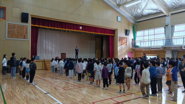 看護当番の先生からは、今週の生活目標「すすんで学習や運動をしよう」のお話がありました。何かに取り組むときに目標があると達成感を感じることができることなど、「すすんで」取り組むためのヒントをいただきました。