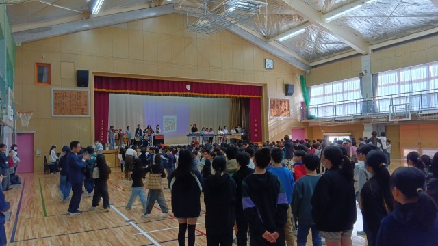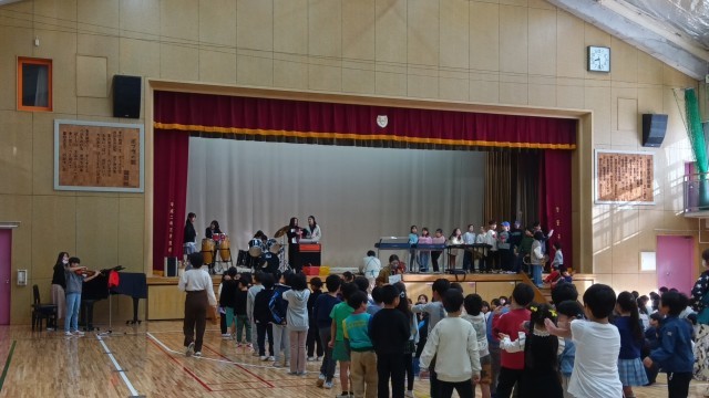 今日の音楽朝会は、3年生から6年生の有志による演奏に合わせて、全校児童で「風になりたい」を合唱しました。バイオリンの音色に包まれながらの入場で始まり、合唱のときは、有志の楽団が体育館を歩きながら奏でる音楽に合わせ、子どもたちの歌声が体育館いっぱいに広がりました。最後はピアノ演奏に見送られての退場でした。心温まる時間となりました。