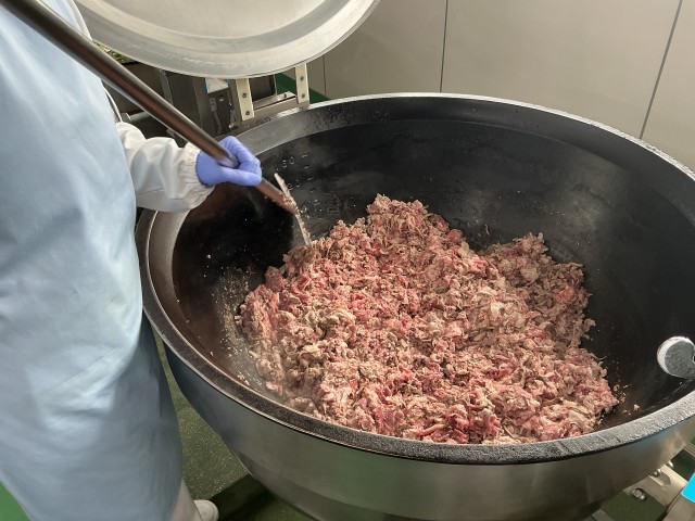 写真は、およそ20kgのお肉を炒めている様子です。お肉はひっくり返しながら火を入れていくので、かなり力のいる作業になります。
