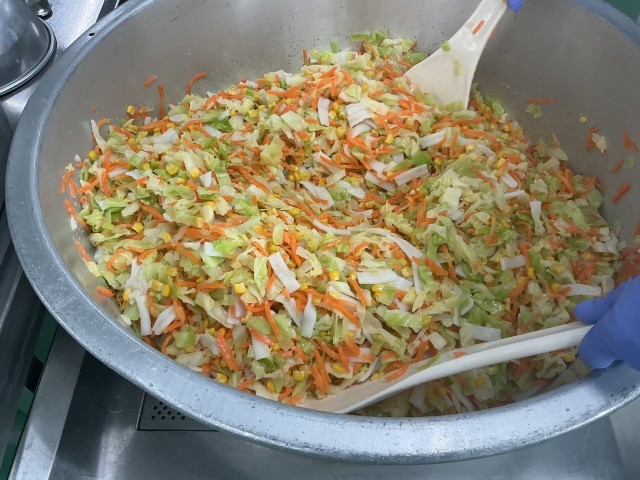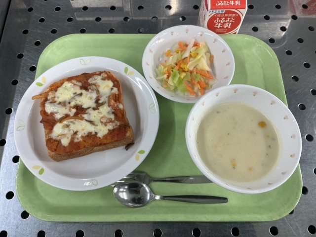今日は、ツナピザトースト、米粉マカロニのサラダ、ポテトコーンポタージュ、牛乳です。