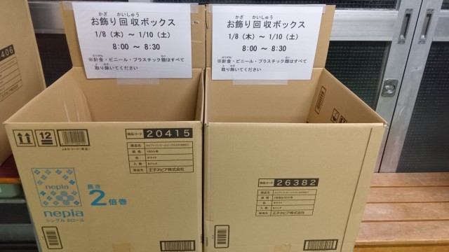 お飾りの回収もあります。家から持ってくるときには、燃えない物(針金、ビニール、プラスチック類)を外して持ってきてくださいね。