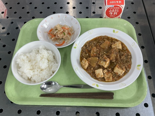 今日は、ごはん、目の教室収穫!麻婆大根豆腐、目の教室の大根サラダ、牛乳です。