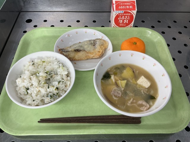 今日は、大根菜ごはん、鯖の竜田揚げ、冬の具だくさんみそ汁、みかん、牛乳です。
