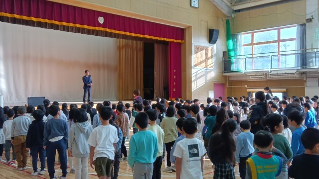 本日の全校朝会では、校長先生からは、現在、全校で取り組んでいる「長縄跳び週間」での大切なポイントについてお話がありました。