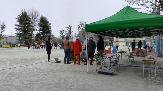 雪がちらつく寒さの中でも、次々ともち米をふかしたり、それをついたり、つきたての餅をわけたりしてくださいました。そのおかげで、会場はおなかも心もぽかぽかに。つきたての寒餅を囲んで、自然と会話もはずむ、あたたかい時間となりました。