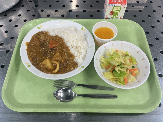 今日は、シーフードカレーライス、キャベツサラダ、つぶつぶみかんゼリー、牛乳です。