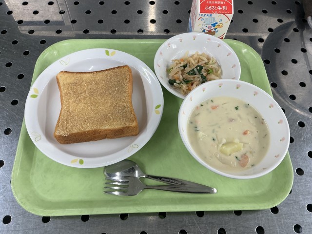 今日は、セサミトースト、ツナと大根のサラダ、シーフードシチュー、牛乳です。