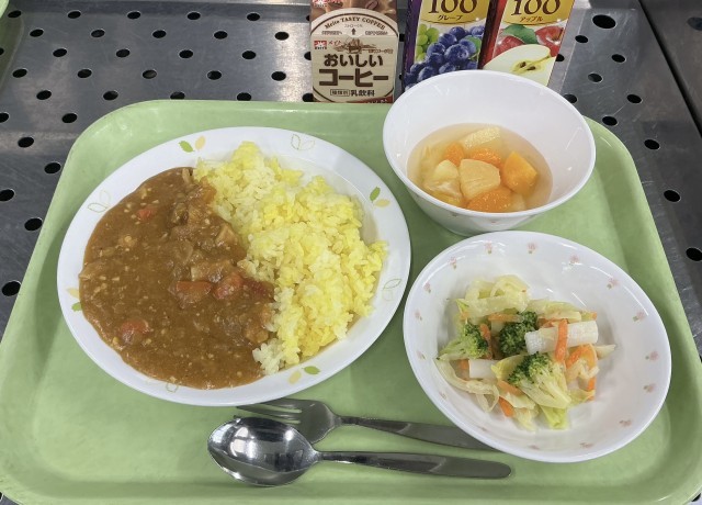 今日は、有機野菜の3学期おつカレーライス、米粉マカロニのサラダ、フルーツポンチ、セレクトドリンク(コーヒー牛乳、ぶどうジュース、りんごジュース)です。