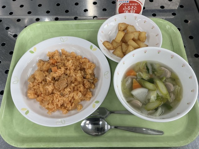 今日は、チキンライス、フライドポテト、春野菜のポトフ、牛乳です。