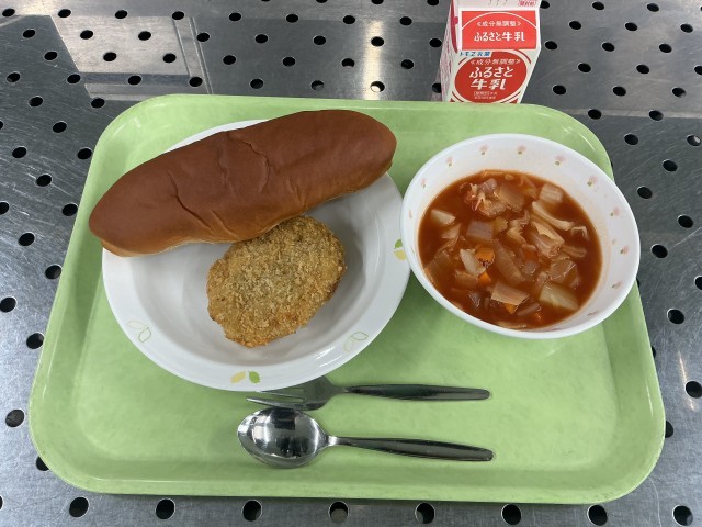 今日は、黒砂糖パン、こまったさんのコロッケ、ミネストローネスープ、牛乳です。