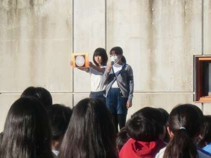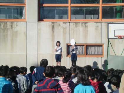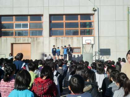 校長講話に続き、今日は16日(日)に行われる子ども駅伝大会に出場する6年生のお友だちを紹介しました。桜丘中学生、桜丘小学校とチームを組んで、大会に臨みます。場所は二子玉川緑地運動場です。スタートは、10時20分です。紹介の後、6年生のスピーチがあり、100円玉のこと、大きな卵のことの内容でした。