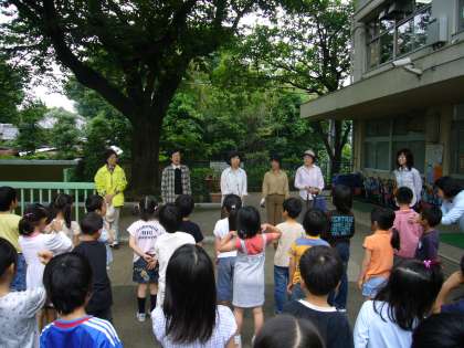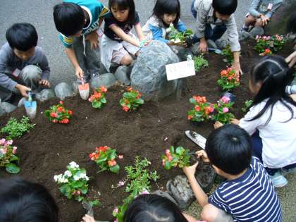 一年生が学校正門近くの歩道にある花だんに苗植えをしました。年に2回行っています。苗を植えたのは初めてという子どももたくさんいましたが、ぐるうぷ街の方々に学んでいっしょうけんめい植えていました。