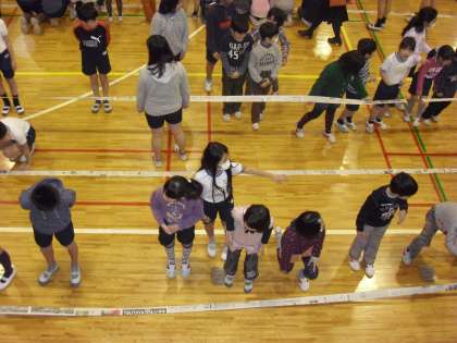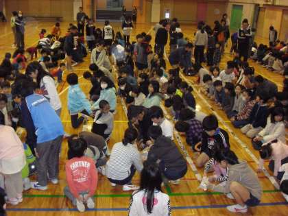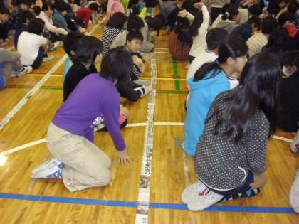 笹の子班に分かれて、協力して長い新聞紙を二つに手でちぎる競争です。