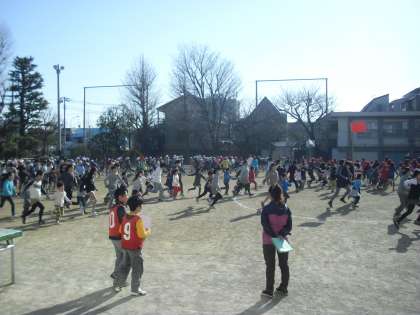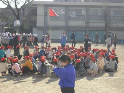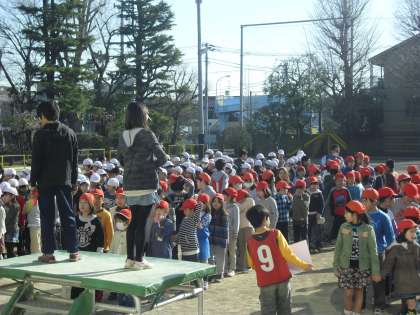 春の温かい陽射しがそそぐ校庭で、追いかけて逃げろ!集会を行いました。