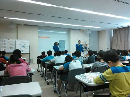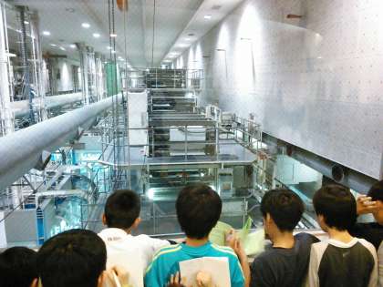 読売新聞府中工場見学スタート 全員そろって写真を撮った後、新聞作りの勉強をします。