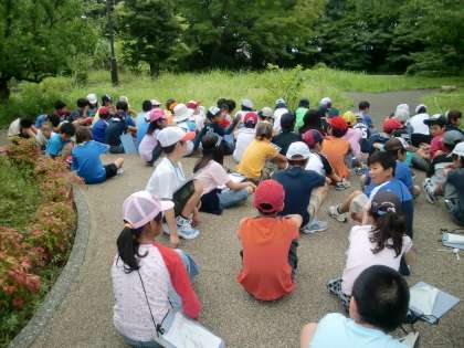 夏の生き物さがしに出かけました。春とは違う生き物や植物の様子を知ることができました。オオシオカラトンボ、バッタ、ナミアゲハ、ツマグロヒョウモン等の昆虫の話を伺ったり、見つけたりすることができました。