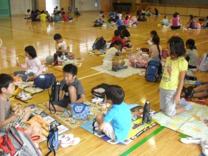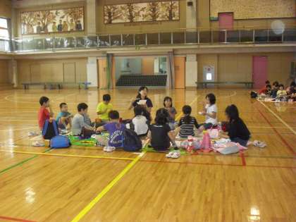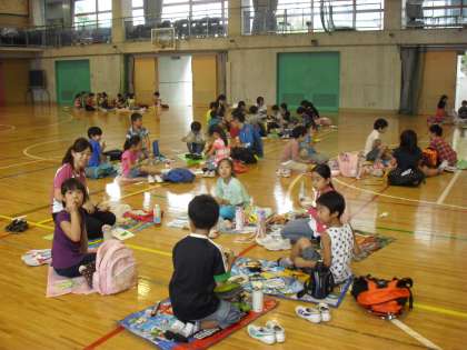 遠足が雨で延期になったので、体育館でみんなでおべんとうを食べました。