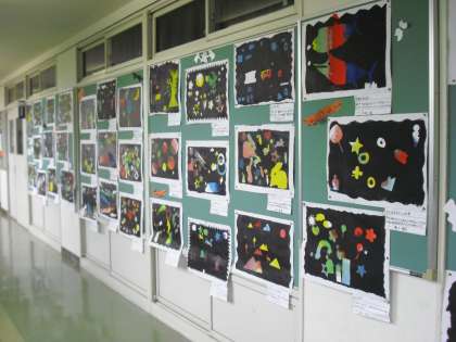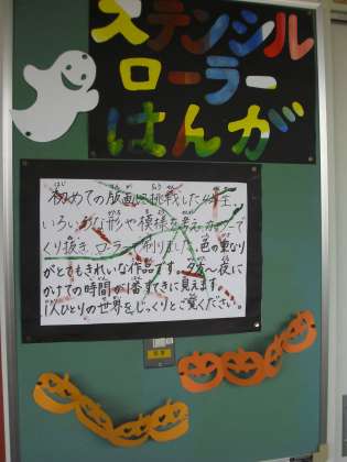 今月のアートロードは、4年生の「ステンシルローラー版画」です。