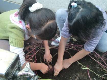 11月6日(水)は、集団活動でした。内容は、学芸発表会のビデオ撮影(通級教室のため、当日全員集合できないので、ビデオ発表するため)、サツマイモと落花生の収穫でした。サツマイモは、何がよかったか巨大芋ばかりでびっくり。つるは、縄跳びの縄になったり、算数の長さの学習用になったり、低学年のリースになります。
