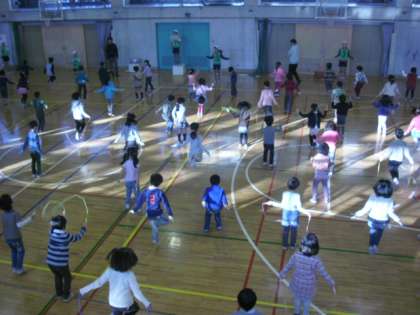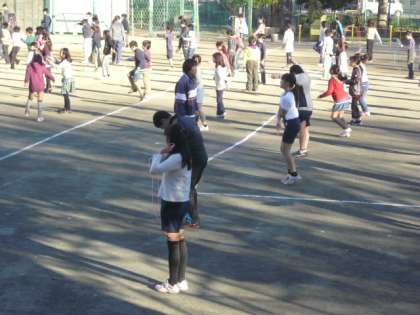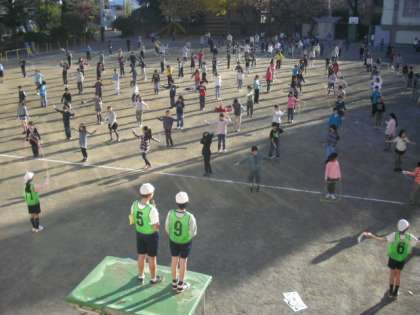 1、2年生は体育館、3年生以上は校庭、2か所に分かれて全校で実施です。
