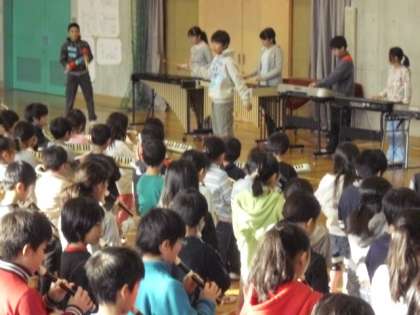 今日の音楽朝会は全校でマンボNo5を合奏しました。