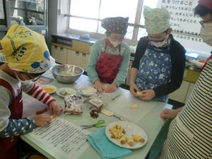 インフルエンザやノロウイルスが流行っているので、みんな参加できるか心配でしたが、無事に実施できました。消毒には念を入れて、担任と本校栄養士さんにも指導者として加わっていただき、家庭科室で4グループにわかれて楽しく作ることができました。