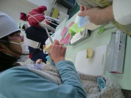 卵を割ること、粉を練りかためること、ひも状にのばしウインナーに巻きつけること、缶を開けること、リンゴをむいたり切ったりと、意外にどの工程も配慮と工夫が必要で難しかったですがおいしかったです。