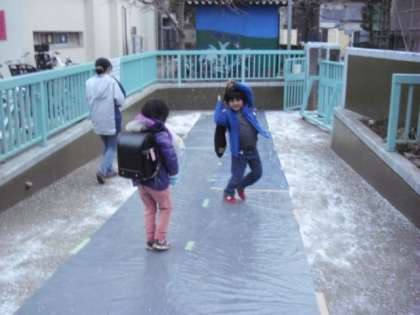 昨日まいた融雪剤(写真は昨日の夕方です。白い粉が融雪剤です)の効果もあって、現時点では、歩行に困難なほどの雪はありません。
