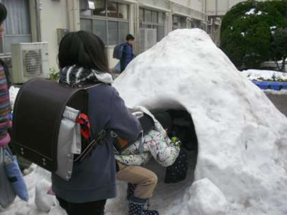 今朝登校してきた子どもたちは、昨日おやじの会のみなさんがつくってくれたかまくらを見て感激。