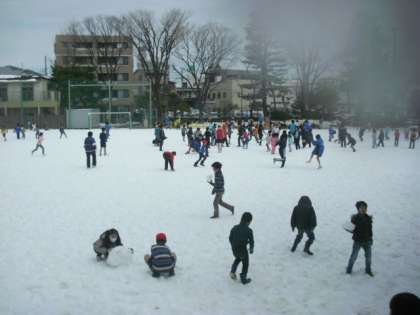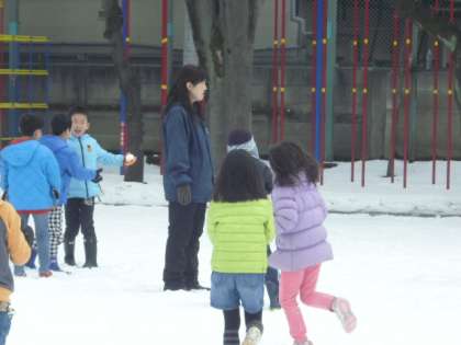次々と走って校庭に降りてきた子どもたちは大喜び。