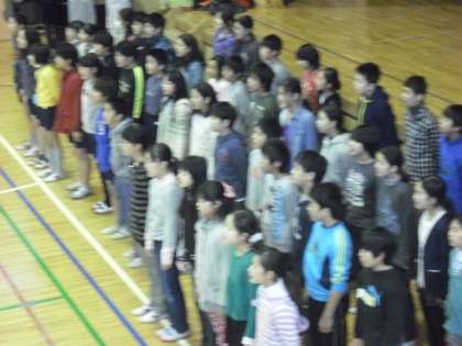 朝会で送る会で歌う「ベストフレンド」の全校練習をしました。