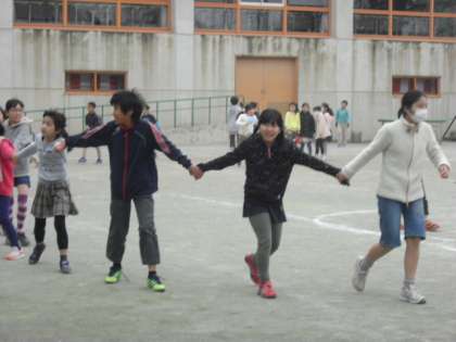 6年生が全員校庭に出て、下級生と遊んでいます。